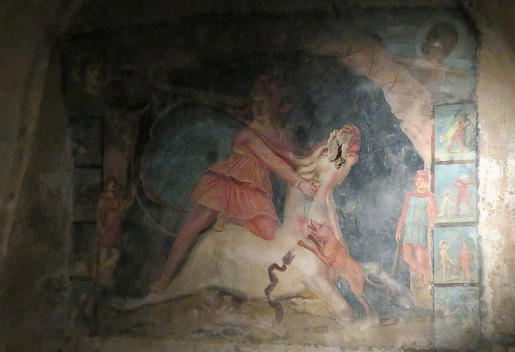 The mithraeum of Marino is one of three such shrines where the image of the god slaying the sacred bull is depicted in a fresco rather than in a relief or a statue. The other two similar shrines are in Rome (near Palazzo Barberini) and at S. Maria Capua Vetere. Some frescoes decorate also other mithraea, but they do not depict the key scene e.g. a mithraeum at Ostia. All the mithraea are relatively small rooms having the aspect of a cave and this explains why a cistern was chosen. In addition the underground location facilitated retaining the secrecy about the ceremonies which were performed.