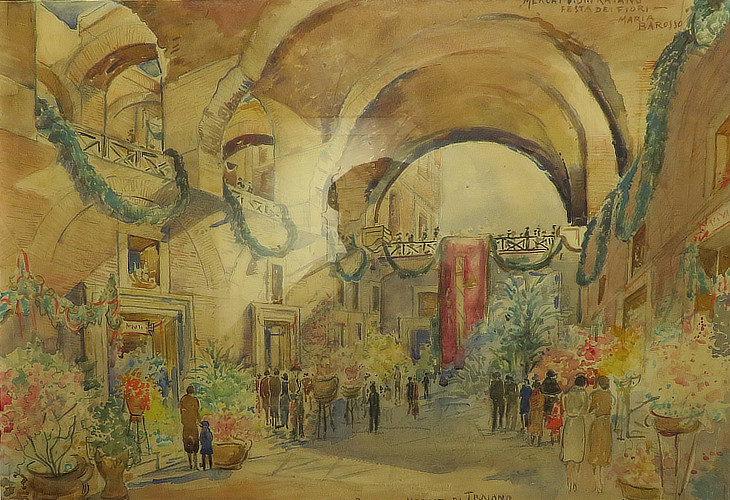 Temporary exhibition at Centrale Montemartini: the Great Hall during a Flower Exhibition in a 1930 watercolour by Maria Barosso, an archaeologist who worked with Antonio Munoz, the Superintendent in charge of a major restoration/reconstruction of the markets
