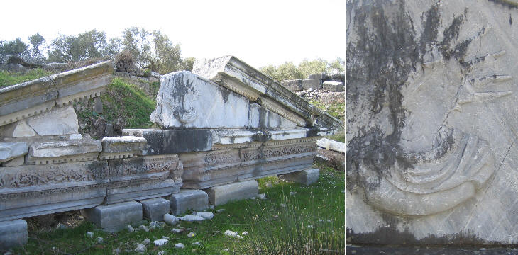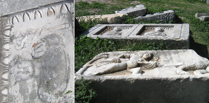 Scattered reliefs: (left) Hermes; (right) a hunting scene and funerary reliefs