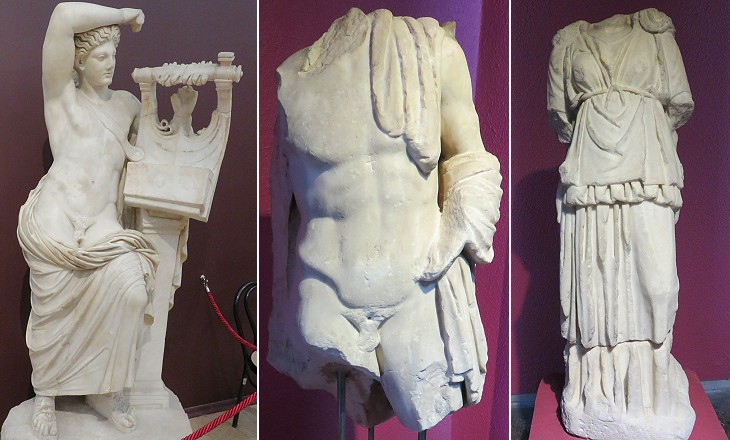 (left) Statue of Apollo found at the Baths of Annia Faustina, now at the Archaeological Museum of Istanbul; (centre/right) other statues found at Miletus, now at the Archaeological Museum of Izmir