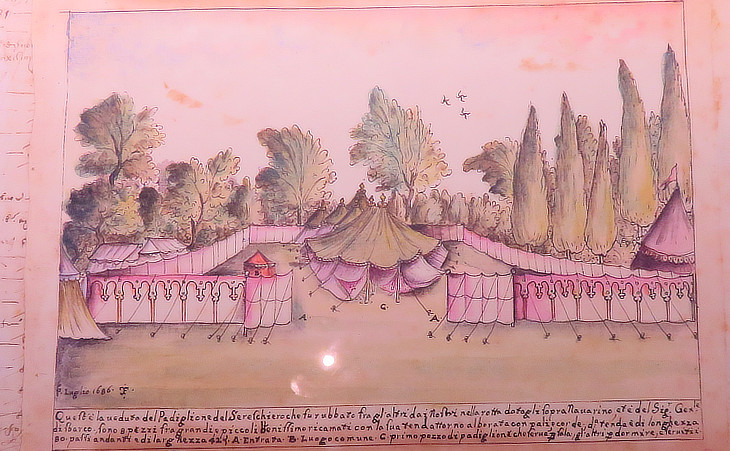 Temporary exhibition at Museo delle Sinopie in Pisa: tents of the Serasker, the commander of the Ottoman army in Morea, which were captured by the Venetians near Navarino, from the album of drawings of Ignazio Fabroni, a Knight of St. Stephen in the Tuscan fleet in 1664-1687