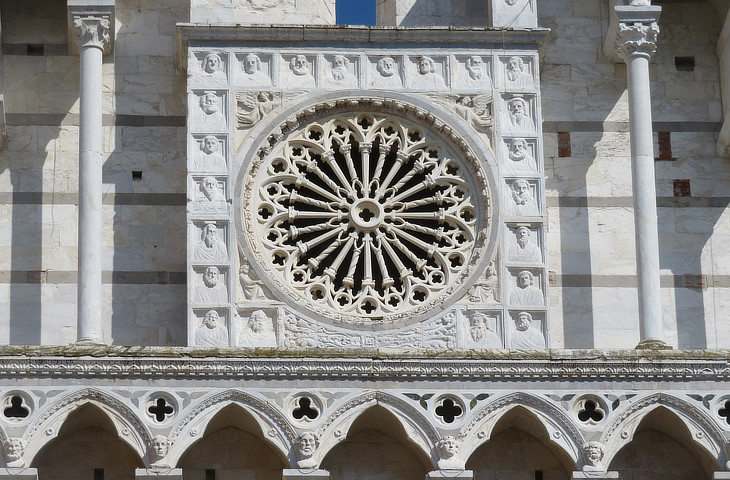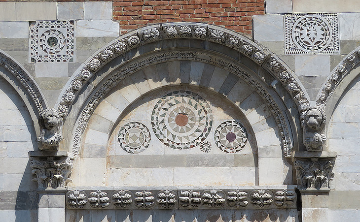The elaborate decoration of the façade can be compared with that of the Cathedral both for the subjects and for the use of coloured marbles. It testifies to the level of excellence achieved by Pisan sculptors, not only by those who are known for their statues and reliefs, but more in general by all stonecutters.