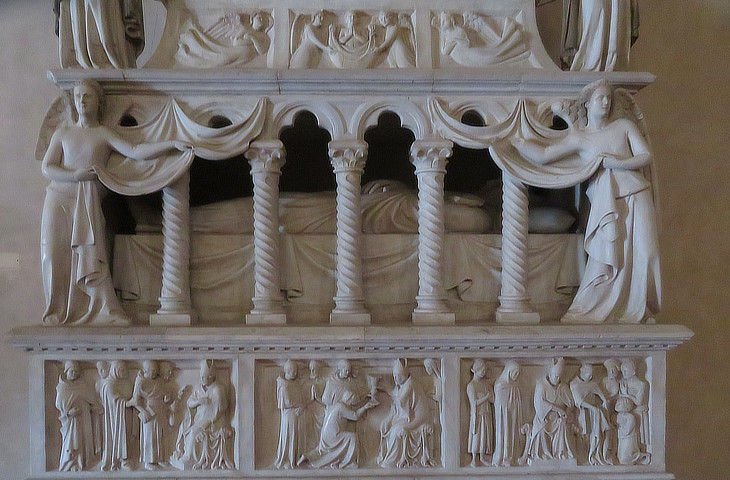 On the l.- hand side of the door, at the bottom of the nave, is the monument of Simone Saltarelli, Bishop of Parma, and afterwards Archbishop of Pisa (died 1342). It is composed of an altar tomb with bas-reliefs; the canopy above is supported by ill-shaped arches; it has marble draperies, which angels draw back, exhibiting the effigy below, which is hardly to be seen in the darkness. It is fine, though cut on the outside only for effect. (..) The bas-reliefs below have character and expression, but the rest is of rude and clumsy workman-ship. Murray
