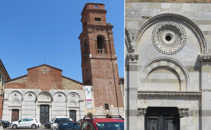San Michele in Borgo: (left) façade; (right) central portal with a group of statues by Lupo di Francesco (originals at Museo Nazionale di S. Matteo) which are very similar to those he made for the Camposanto