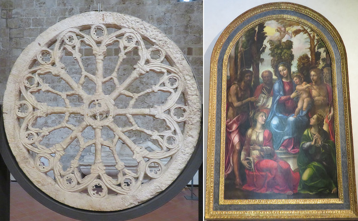 Museo Nazionale di S. Matteo: (left) rose window from the southern side, probably executed under the supervision of Lupo di Francesco; (right) Sacra Conversazione (a depiction of the Virgin and Child amidst a group of saints in a relatively informal grouping) by Giovanni Antonio Bazzi, aka Il Sodoma (1542)