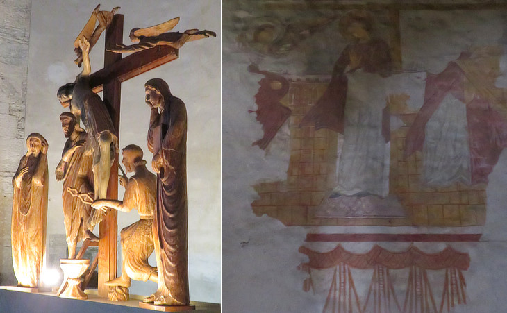 Pieve di S. Maria - XIIIth century works of art: (left) wooden Deposition; (right) fresco depicting the Annunciation