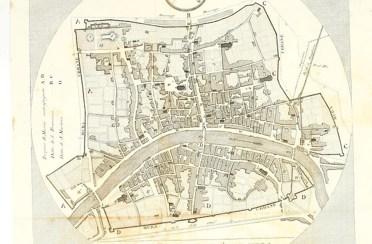by Ranieri Grassi - 1836". It shows the division of the town into three districts (terzieri): Terziere di S. Martino, south of the River; Terziere di S. Maria (the Cathedral) from the western walls (A in the map) to Via di Borgo, a straight street (B) which crosses the northern part of the town and Terziere di S. Francesco from Via di Borgo to the eastern walls (C)