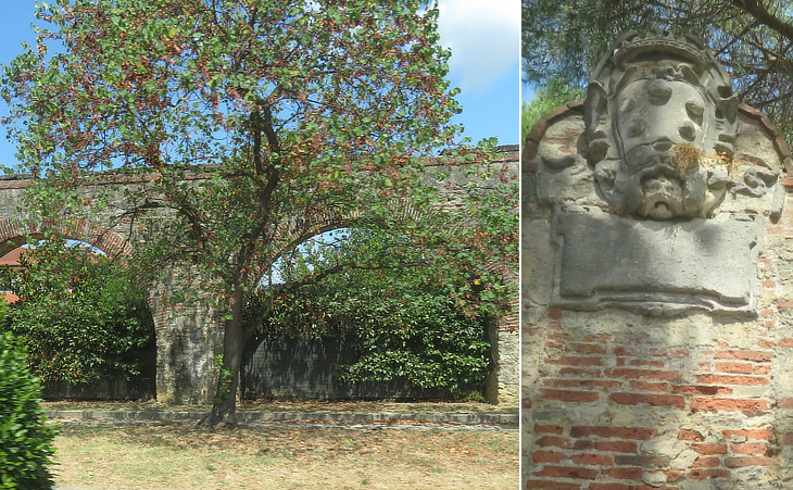 Aqueduct: (left) some of its remaining arches; (right) early XVIIth century Medici coat of arms