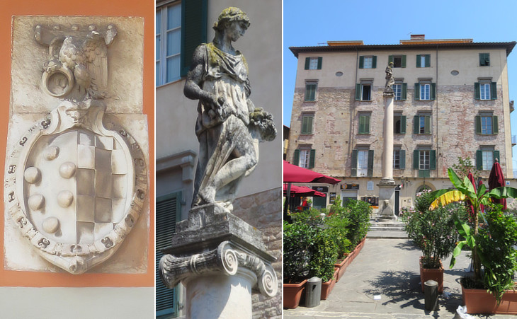 Piazza Cairoli: (left) coats of arms of Cosimo I de' Medici and his wife Eleanor of Toledo (daughter of Pedro Alvarez de Toledo, viceroy of Naples) inside the Collar of the Golden Fleece; (centre) statue of Dovizia; (right) modernized XIIth century building at the eastern side of the square