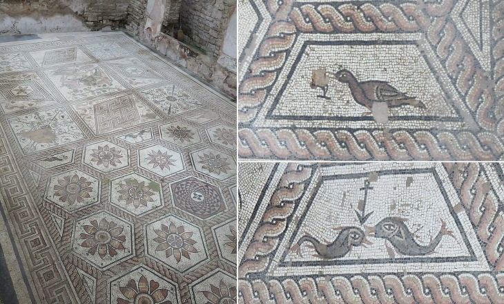 A large mosaic was unearthed during the construction of a modern building on the site of one damaged by WWII bombing. It is rectangular, fairly large (12x6m/40x20ft) and with no signs of walls dividing it. The design however shows a section with mainly hexagonal geometric motifs and another one with nine small square panels, as if the two sections had different uses.