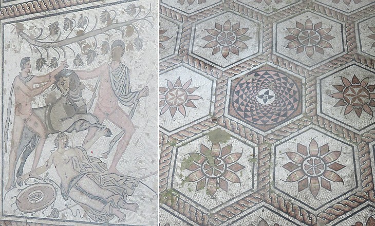 Mosaic of a Roman house near Arco dei Sergii: (left) Punishment of Dirce; (right) optical pattern