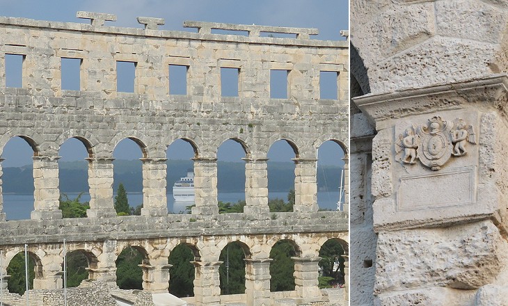 In the late XVIth century the Venetians debated whether the building could not impair the defence of the town by providing Ottoman assailants with a sheltered site where they could easily set their camp and place their guns. Senator Gabriele Emo successfully opposed the destruction of the amphitheatre and, as a sign of gratitude, the citizens of Pola placed a celebratory inscription and his coat of arms on one of the towers (in 1579 the Republic of Venice levied a tax for repairing the amphitheatre of Verona).
