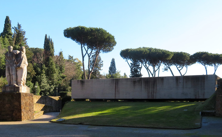 Very close to the catacombs there are other pines next to a sort of modern catacomb. In March 1944 a bomb exploded in Via Rasella, near Palazzo Barberini just as a platoon of German troops was marching by, killing 33 soldiers. In retaliation 335 Italians, either detained for political and racial reasons, or picked at random, were killed in a tufa cave (Fosse Ardeatine) near the catacombs. The heavy block covering the 335 tombs is surrounded by an impressing ring of pines.