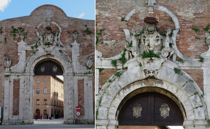 (left) Porta Camollia (1604); (right) detail of the gate with a coat of arms of Grand Duke Ferdinand I and the inscription "Cor magis tibi Sena pandit" (Siena opens her heart which is bigger than this gate to you).