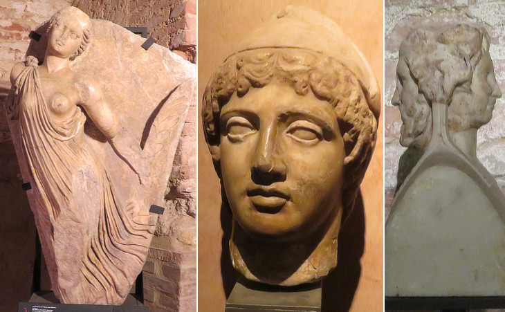 Exhibits of the Roman age: (left) IInd century AD fragment of relief from near S. Agostino; (centre) head of a young man (perhaps Paris); (right) herm