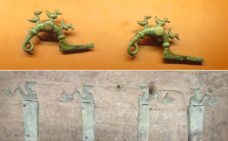 (above) Ancient bronze brooches (from Sovicille - Fondo Capitani - VIIth century BC); (below) bronze legs of a brazier (Vth century BC)