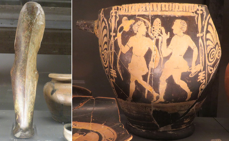 (left) Tomb at Monteroni d'Arbia: VIth century BC bronze leg protection; (right) IVth century BC vase
