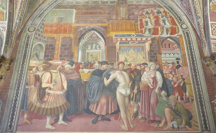 This fresco depicts some of the corporal works of mercy, i.e. feeding the hungry, giving water to the thirsty, clothing the naked and sheltering the homeless (and the pilgrims). It shows the weekly distribution of bread to the poor and it features figures of pilgrims, sick individuals, and nobles, such as the Emperor Sigismund who spent some months in Siena before moving to Rome where he was crowned by Pope Eugenius IV.