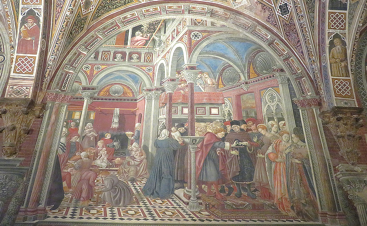 In 2021 the ancient hospital reopened as a museum complex and the damaged frescoes of the Pellegrinaio appeared in their pristine splendour after a lengthy and careful restoration. In this fresco (on the left), a courtyard shows child care and a teacher leading some students, including a young girl. On the right, a wedding is being celebrated in a chapel, with the rector acting as witness holding the bride's dowry. The conclusion of the ceremony is accompanied by music played by young women. The marriage of young poor women was a practice that was part of the hospital's activities in providing assistance and social support during the medieval period (see a similar practice in Rome).