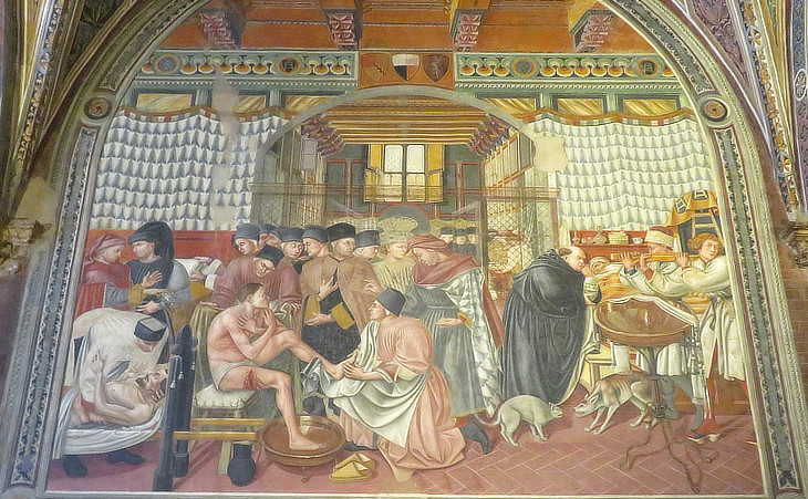 This is without doubt one of the most renowned frescoes among those painted on the walls of the Pellegrinaio, where the hand of Domenico di Bartolo indulges with extraordinary attention to detail. The scene unfolds in a large longitudinal space, covered by a beamed ceiling supported by large corbels. Near the center, above the keystone of the arch, are the coats of arms of the Capitano del Popolo, the Balzana (the black-and-white emblem of Siena), and that of Carlo d'Agnolino Bartoli, rector of Santa Maria and later bishop of the city. This detail has allowed scholars to confidently identify the setting as the Pellegrinaio, built in 1378, whose wooden ceiling was constructed during Bartoli's rectorship. At the far right of the fresco, two attendants are carrying a stretcher draped with a cloth bearing the symbols of the Scala. Behind them, a dying man is seen lying in bed, his head bandaged. A large Augustinian friar leans over the patient, likely hearing his confession. The central group features, in the foreground, a man wearing only a loincloth, with a large bleeding wound on his right thigh; one foot is soaking in a copper basin, while the other is being dried by a hospital friar. Near the centre of the scene stands a "cerusico" (a surgeon-physician), next to whom is the rector. Below, an orderly is laying a person onto a stretcher. In its extraordinary detail, the scene offers a vivid snapshot of medical care within the hospital. From the Museum website