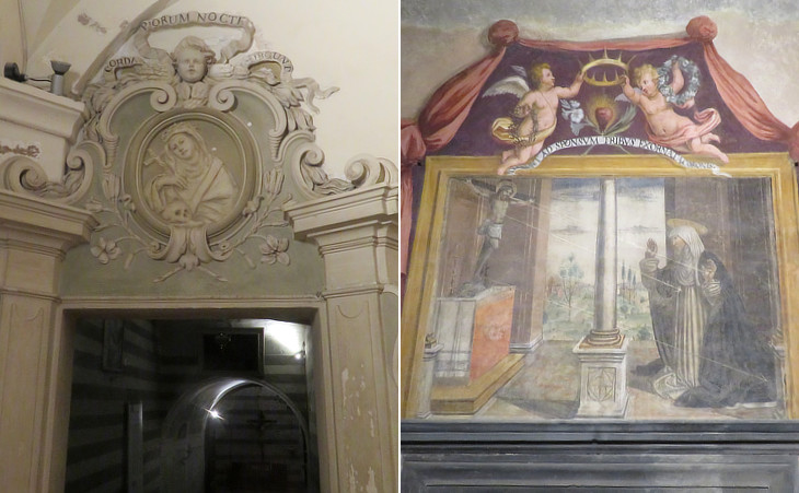 Oratorio della Confraternita di S. Caterina della Notte: (left) stucco decoration of the entrance with the inscription "CORDA PIORUM NOCTE SURGUNT"; (right) fresco depicting St. Catherine receiving the stigmata with the inscription "TRANSIT AD SPONSUM TRIBUS EXORNATA CORONIS", a quotation from Cornelius a Lapide, a Jesuit who wrote a Commentary to the Sacred Scriptures (1617) where he indicated that St. Catherine ought to be portrayed with three crowns; the depiction of the stigmata of St. Catherine was at the centre of a long debate which was settled in 1630 by Pope Urban VIII