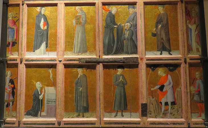 The relic press in the Spedale, of which he painted the doors inside and out in 1445 with twenty-five different subjects serves to illustrate the decline of Siennese art since Duccio (see a similar painting by Duccio). Twelve panels in the next two courses contain (from left to right) SS . Ansano, Ambrogio Sansedoni (beato), Bernardino, Agostino Novello (beato giving the dress), Galerani (beato), Savino, Victor, Catherine of Sienna, unknown (Pier Pettinaio), unknown (Sorore), Galgano, and Crescenzio. Crowe and Cavalcaselle