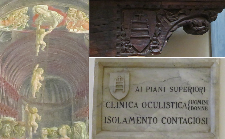 (left) Detail of a fresco by Lorenzo Vecchietta (ca 1441 in the "Pellegrinaio", the main ward of the hospital) depicting the dream of the mother of Sorore, the founder of the hospital; (right-above) symbol of the hospital on a wooden lintel; (right-below) the same on a XXth century plaque when the building was still used as a hospital; the symbol is also shown in the image used as background for this page (from the façade of Casa delle Balie, the old part of the building)