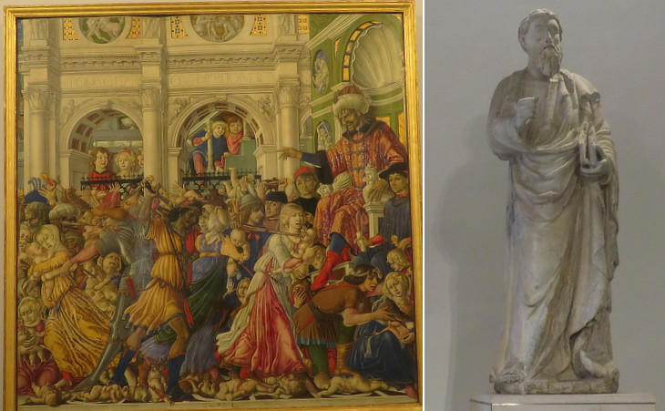 Works of art from other locations: (left) The Massacre of the Innocents by Matteo di Giovanni (1484) from S. Agostino; (right) St. Bartholomew by Lando di Stefano from Cappella di Piazza