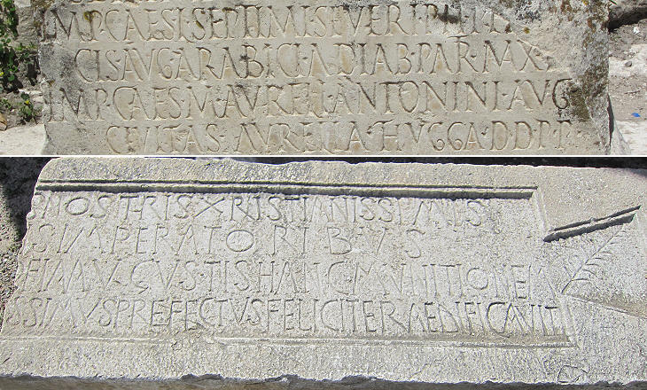 Photos showing the decline in the quality of inscriptions: (above) making reference to "Civitas Aurelia Thugga" at the time of Emperor Caracalla; (below) celebrating the construction of fortifications at the time of Byzantine Emperor Justin II (565-78) at Teboursouk, four miles from Thugga