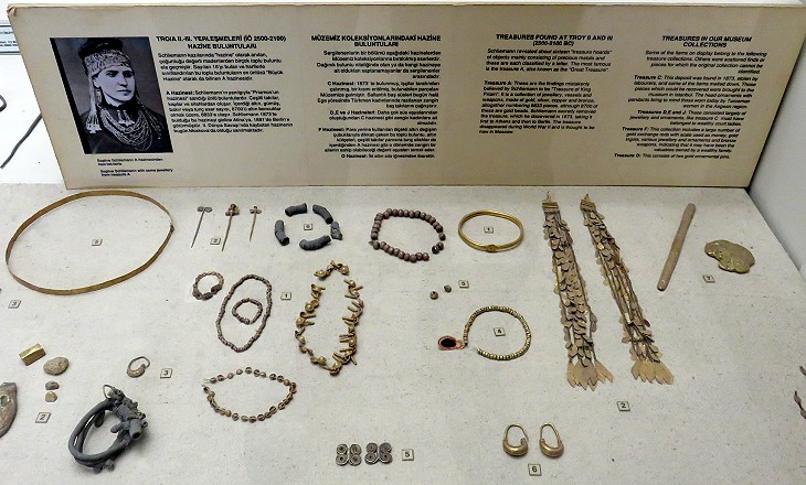 Archaeological Museum of Istanbul: jewels found at Hisarlik and photo of Heinrich Schliemann's wife wearing some of those which were part of "Priam's Treasure"