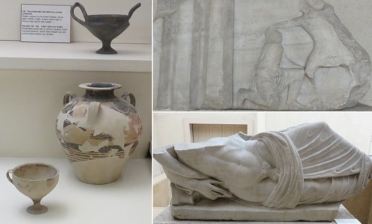 Archaeological Museum of Istanbul: Schliemann's findings: (left) pottery of different periods; (right-above) fragment of a frieze dated 300 BC; (right-below) statue of a river god (Roman period)