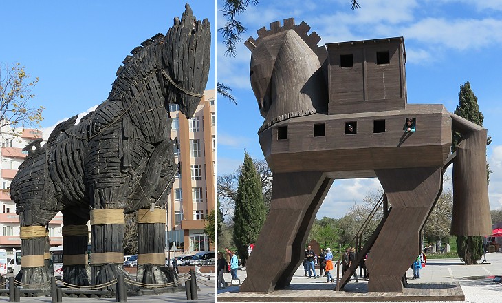 Trojan Horses: (left) at Canakkale (it was made for the movie "Troy"); (right) at the archaeological site