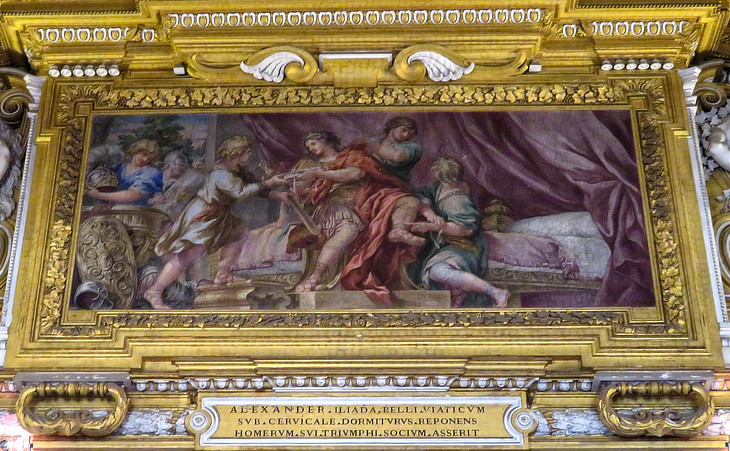 Florence - Galleria Palatina: Alexander the Great places Homer's Iliad and his dagger under his pillow (as reported by Plutarch), fresco by Ciro Ferri (1659-1661)