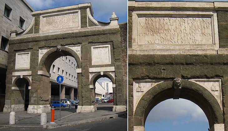 In 1585 Pope Sixtus V celebrated the completion of Acqua Felice, an aqueduct which carried water to the northern parts of Rome and ended at Mostra dell'Acqua Felice, by erecting a triumphal arch a short distance from that built by Augustus. It was decorated with the heraldic symbols of the Pope which included a lion and three mountains. The inscription on the southern side of the arch celebrates the opening of two roads which led to S. Maria Maggiore and to S. Maria degli Angeli: they increased the value of Pope's large villa between the two churches.