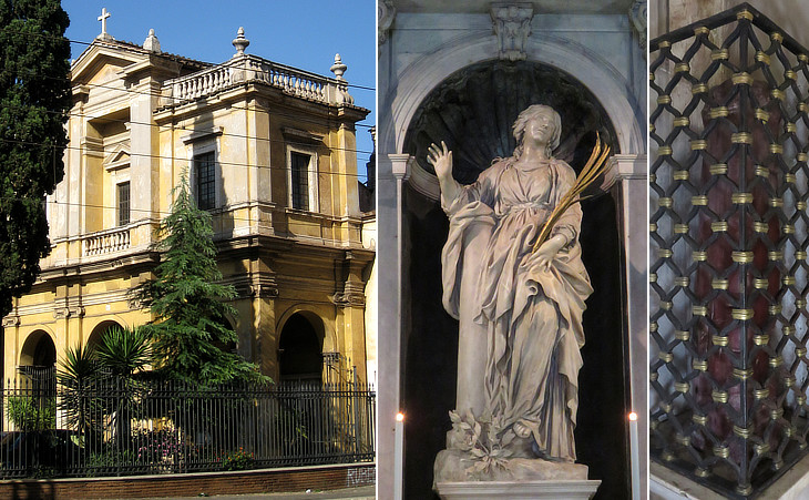 (left) S. Bibiana - façade; (centre) statue of St. Bibiana (Vivian); (right) column to which the martyr was tied; the wrought iron case resembles the design of that in the balustrade of Ponte S. Angelo