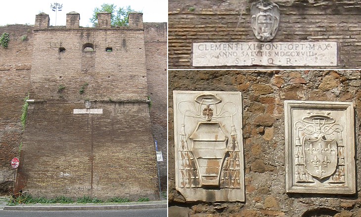 (left) Tower restored by the Senate of Rome in 1718; (right-above) coat of arms of Pope Clement XI and inscription explaining