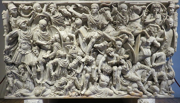 showing a battle between Romans and barbarians. The latter appears to depict an actual scene of fight, whereas Sarcofago Grande Ludovisi could have had a more complex symbolic meaning. The barbarians seem to die because of illness rather than because of the fight. Their portrayal was most likely influenced by a major pestilence which began to strike the Empire in 250. The young commander does not seem to care about the fight.