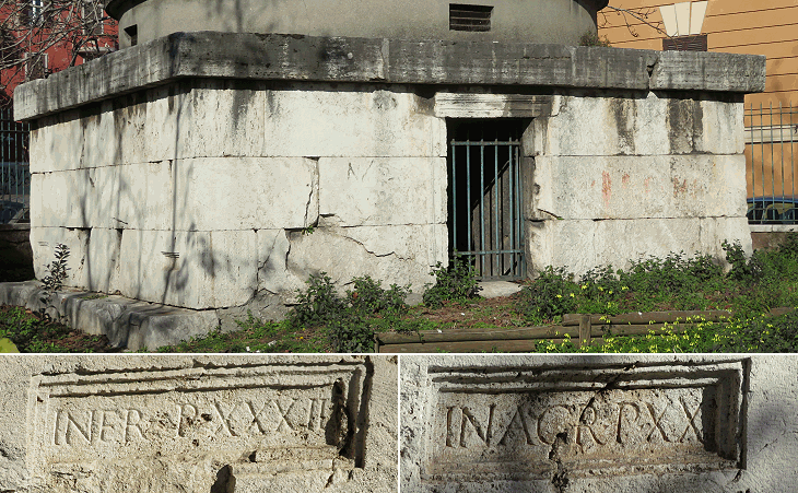 Via Collatina was a minor road which linked Rome with Collatia, an ancient town 8 miles east of the city. It branched off Via Tiburtina very near the gate and it run eastwards parallel to it and to Via Prenestina. In 1935, during sewage excavations, a small mausoleum of the early Ist century AD was found at a depth of 5m/15f. It still contained a skeleton and two small vessels. It was filled with earth, most likely because a flood covered it in the IIIrd century. It had a (lost) small dome and it was faced with travertine. Two inscriptions indicated its size: IN FR(ons) P(edes) XXXII (32 ft on the front); IN AGR(o) P(edes) XX (20 ft deep). These inscriptions are not unusual (see those at Parco Archeologico del Celio), because they indicated the area allocated to the tomb from a legal point of view and they can be found also outside Italy, e.g. at Narbonne.