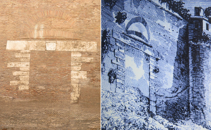 (left) Posterula of "Horti Liciniani"; (right) detail of an 1829 engraving by Luigi Rossini
