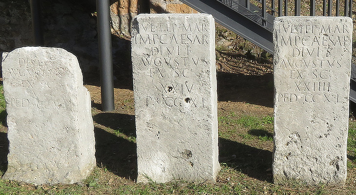 Parco Archeologico dell'Antiquarium Comunale: three stone markers of the repairs made by Augustus to "Iulia Tepula Marciana" one of the aqueducts. These repairs were mentioned by the Emperor in "Res Gestae Divi Augusti": "Aqueducts which were crumbling in many places by reason of age I have restored, aud I have doubled the water which bears the name Marcian by turning a new spring into its course"