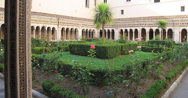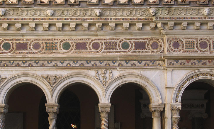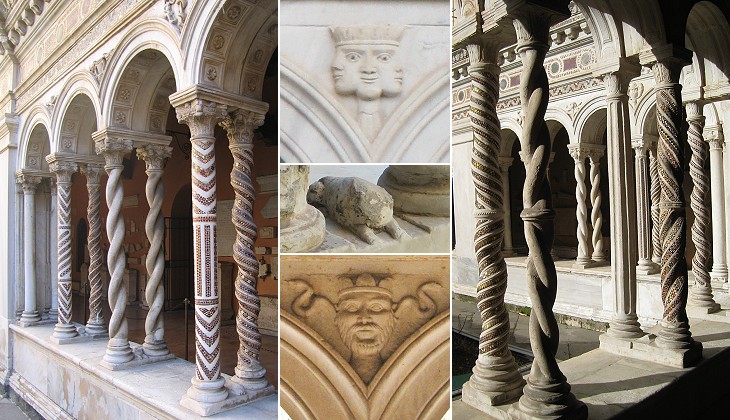 A detail which identifies the works by Vassalletto is the (unexplained) presence of small sphinxes between the pairs of columns. It can be observed also in the cloister of S. Giovanni in Laterano, which they decorated in a very similar way. You may wish to see the glass inlaid columns of the Cloister of Monreale in Sicily.