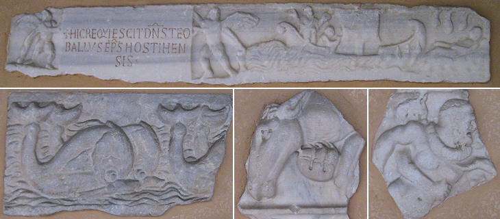 (above) Fragment of an ancient sarcophagus reutilized for Cardinal Theobald, Bishop of Ostia and former Abbot of Cluny (d. 1188) depicting episodes of the life of Jonah; (below) other fragments of sarcophagi. You may wish to see another interesting sarcophagus portraying Achilles in the arms of Chiron, a centaur