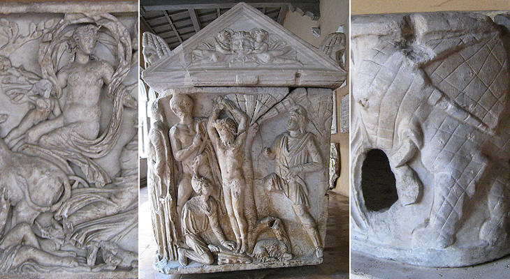 Details of sarcophagi: the central one portrays the punishment of Marsyas and it was reutilized as the tomb of Pietro di Leone, after whom the Pierleoni family was named. Marsyas was a satyr who was flayed alive for having challenged Apollo to a contest of music