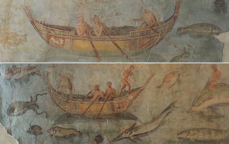 In 1915 walls of an ancient Roman house were detected in the area opposite the monastery on the other side of the river. In 1939-1941 an excavation campaign led to uncovering some carefully painted small rooms. One in particular had an elaborate fresco decoration depicting sea creatures and fishermen (a popular subject, especially for floor mosaics). Their boats were in turn decorated with small paintings. The image of one of the boats is reflected in the water. The stamped brands of the bricks indicate that the room was built in 123 AD.