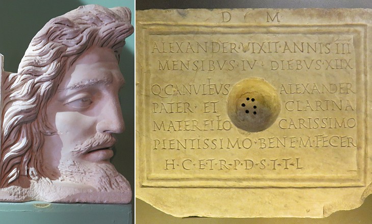 The tiny holes of the funerary table were used for profusiones, pouring in of wine or milk or pieces of cakes in honour of the dead who in this case was Alexander, a child aged three years, four months and eighteen days. The final part of the long acronym (T R P D S T T L) stands for Te Rogo Praeteriens Dicas Sit Tibi Terra Levis (I ask you in passing to say: May the earth lie lightly on you!).