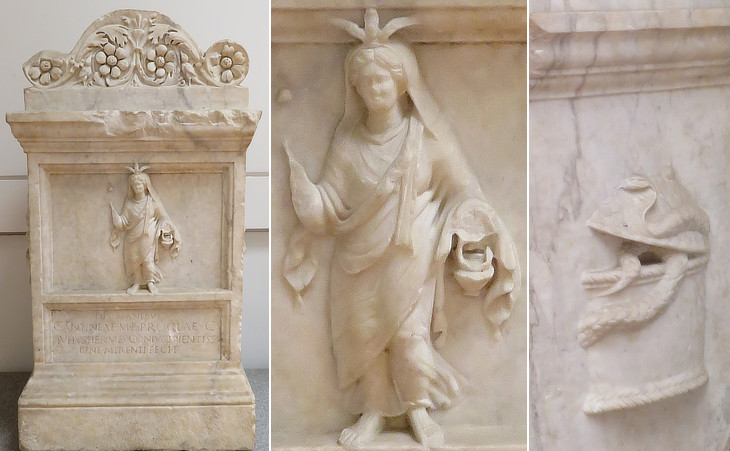 The altar was dedicated by Iulius Hermes to his wife Cantinea Procla. She is identified as an Isis' priestess by her headgear which shows a snake between two grain ears, by her garment and by the situla, a holy vessel with a handle at the top (the right hand most likely held a sistrum). The sides of the altar depict a cysta mistica, the wicker basket containing the instruments for the ceremonies wrapped in the coils of a snake. See another funerary relief portraying an Isis' priestess along Via Appia and a statue at Taormina.
