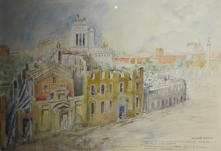 Temporary exhibition at Centrale Montemartini: S. Urbano and other buildings on the eastern side of Strada Alessandrina in the process of being pulled down in a 1933 watercolour by Maria Barosso, an archaeologist. This and some other paintings were made at the request of Antonio Munoz, the Superintendent in charge of the opening of Via dei Fori Imperiali