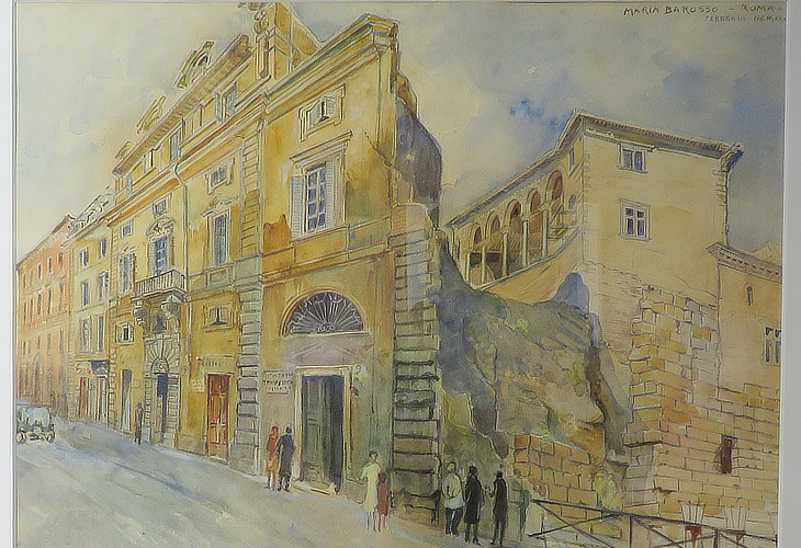 Temporary exhibition at Centrale Montemartini: Casa di Flaminio Ponzio and other buildings on the western side of Strada Alessandrina in the process of being pulled down in a 1930 watercolour by Maria Barosso