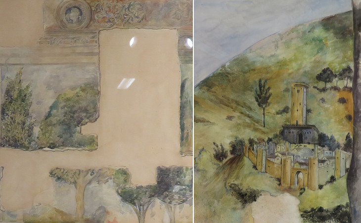Temporary exhibition at Centrale Montemartini: frescoes which were discovered in the loggia in 1928 watercolours by Maria Barosso, an archaeologist: (left) overall design of the frescoes; (right) a walled town