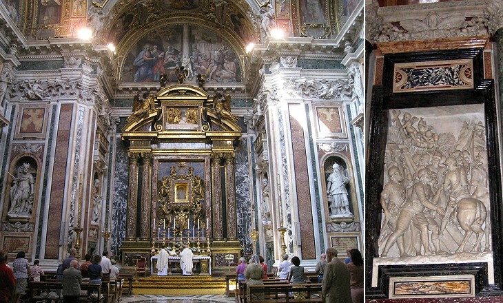 (left) Main altar housing the image of the Virgin Mary as "Salus Populi Romani" (Protectress of the Roman People). Its pediment has a relief depicting "The Miracle of the Snow"; (right) relief depicting the 1595 Fall of Strigonia (today's Esztergom), a town on the River Danube in northern Hungary, which was the capital of an Ottoman province and which was conquered by a Holy Alliance promoted by Pope Clement VIII; see another relief celebrating the annexation of Ferrara